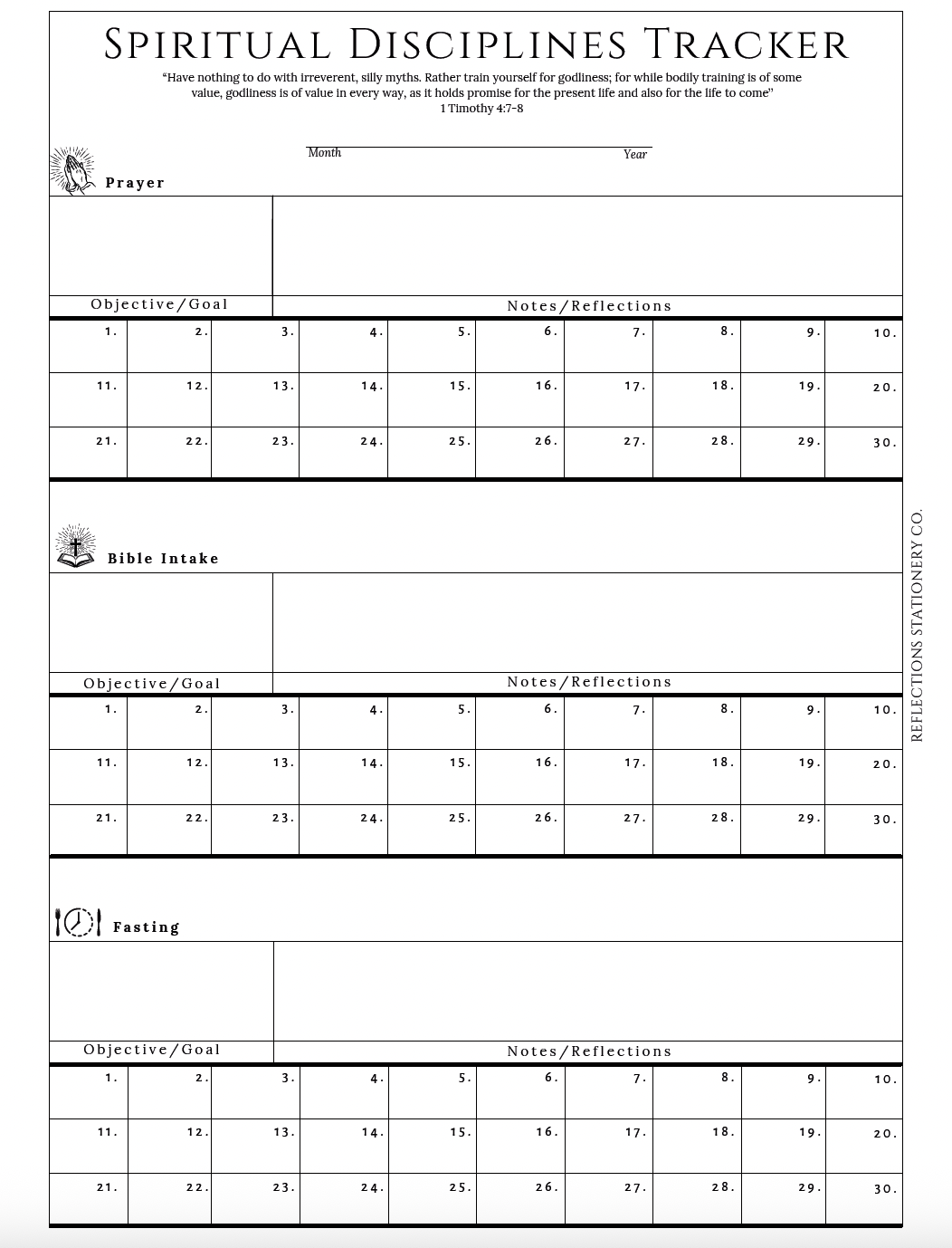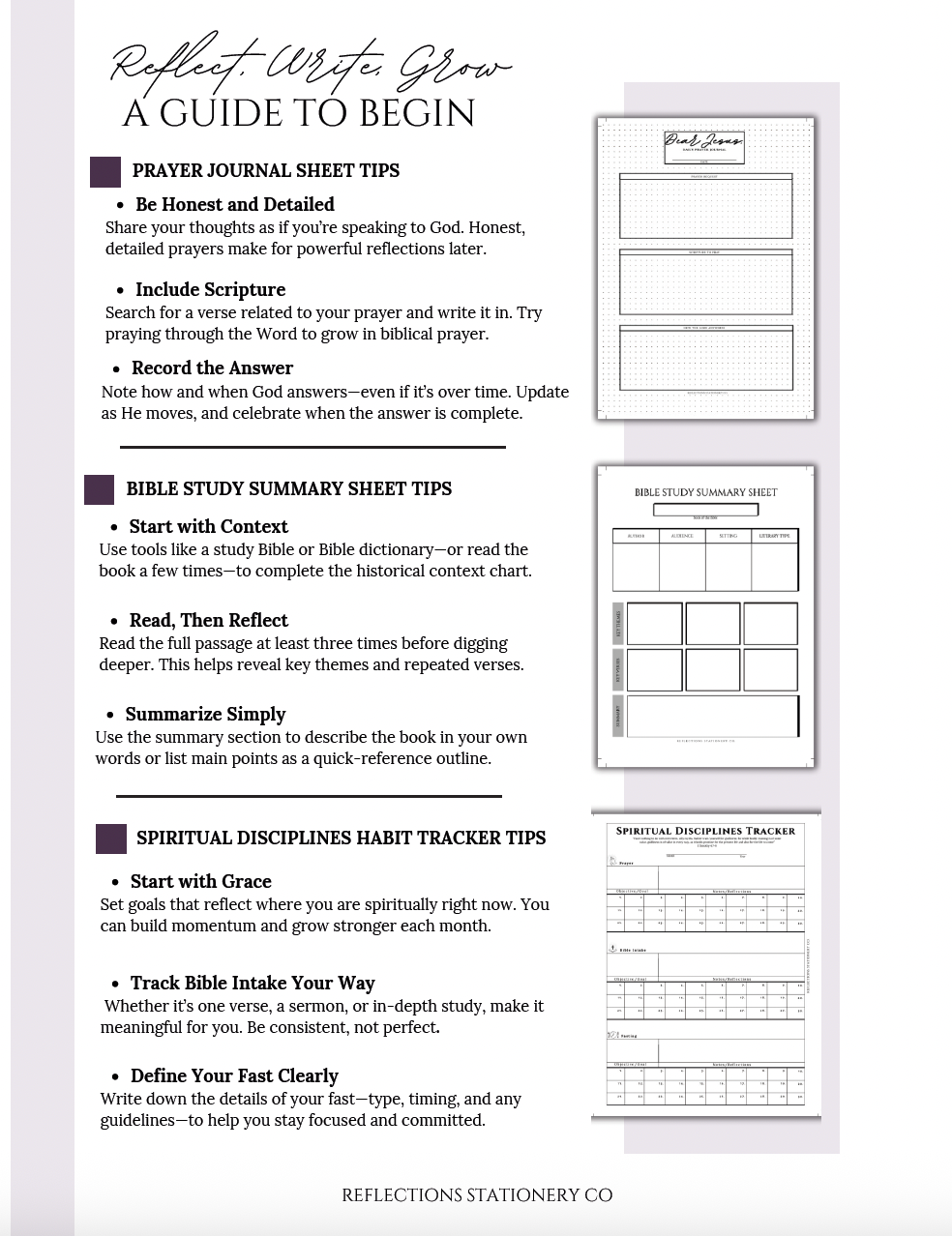 Three journaling pages to jumpstart your spiritual growth. Includes a prayer journaling page, a Bible study summary sheet, and a spiritual disciplines habit tracker. Perfect for print or digital use.