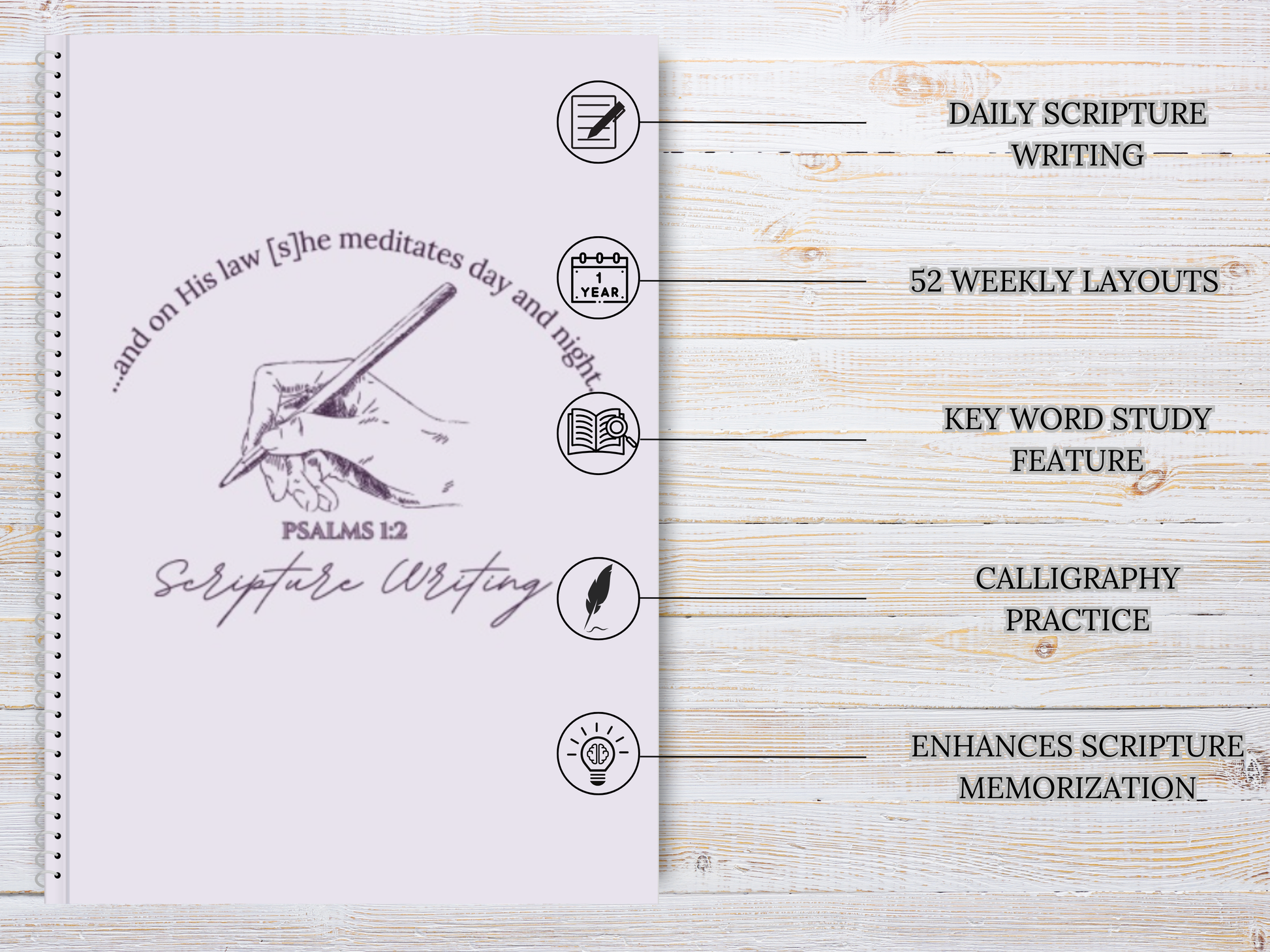 Meditate on Scripture with our thoughtfully designed Scripture Writing Journal. Each layout contains space for you to write out scripture in your own handwriting, 7 days/week for every week of the year. Use our journal to enhance scripture memorization, study a specific passage in depth, or even to simply practice handwriting and calligraphy techniques while simultaneously spending time in God's word.