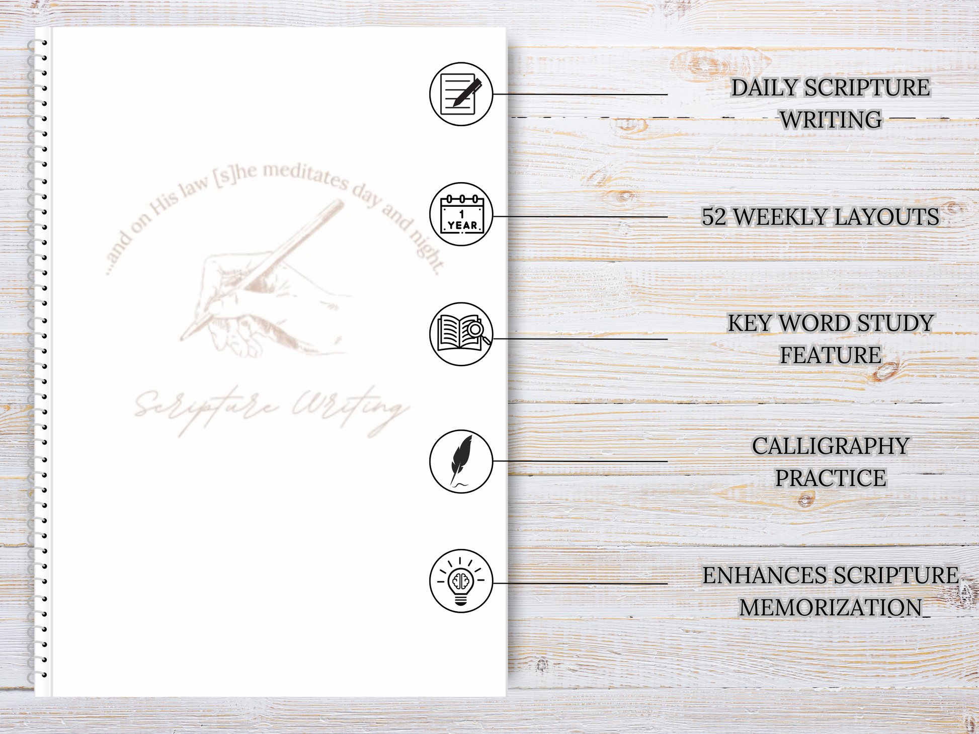 Meditate on Scripture with our thoughtfully designed Scripture Writing Journal. Each layout contains space for you to write out scripture in your own handwriting, 7 days/week for every week of the year. Use our journal to enhance scripture memorization, study a specific passage in depth, or even to simply practice handwriting and calligraphy techniques while simultaneously spending time in God's word.